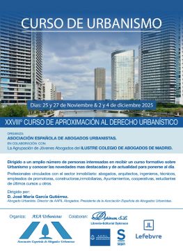 A celebrar días 25 y 27 de noviembre y 2 y 4 de diciembre. Magistrados, Técnicos, Abogados Urbanistas y Directores Generales de Urbanismo lo imparten en Madrid. Colabora Agrupación de Jóvenes Abogados del Colegio de Madrid.